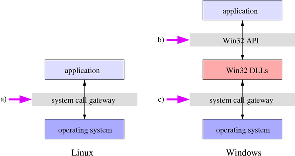 En el mundo Windows en general, las llamadas al sistema se denominan API (Windows application programming interface), es un conjunto de funciones residentes en bibliotecas (generalmente dinámicas, también llamadas DLL por sus siglas en inglés, término usado para referirse a éstas en Windows) que permiten que una aplicación corra bajo un determinado sistema operativo. Por ejemplo, Windows proporciona una función denominada FlashWindowEx que permite que la barra de título de una aplicación alterne entre un sombreado claro y otro oscuro.